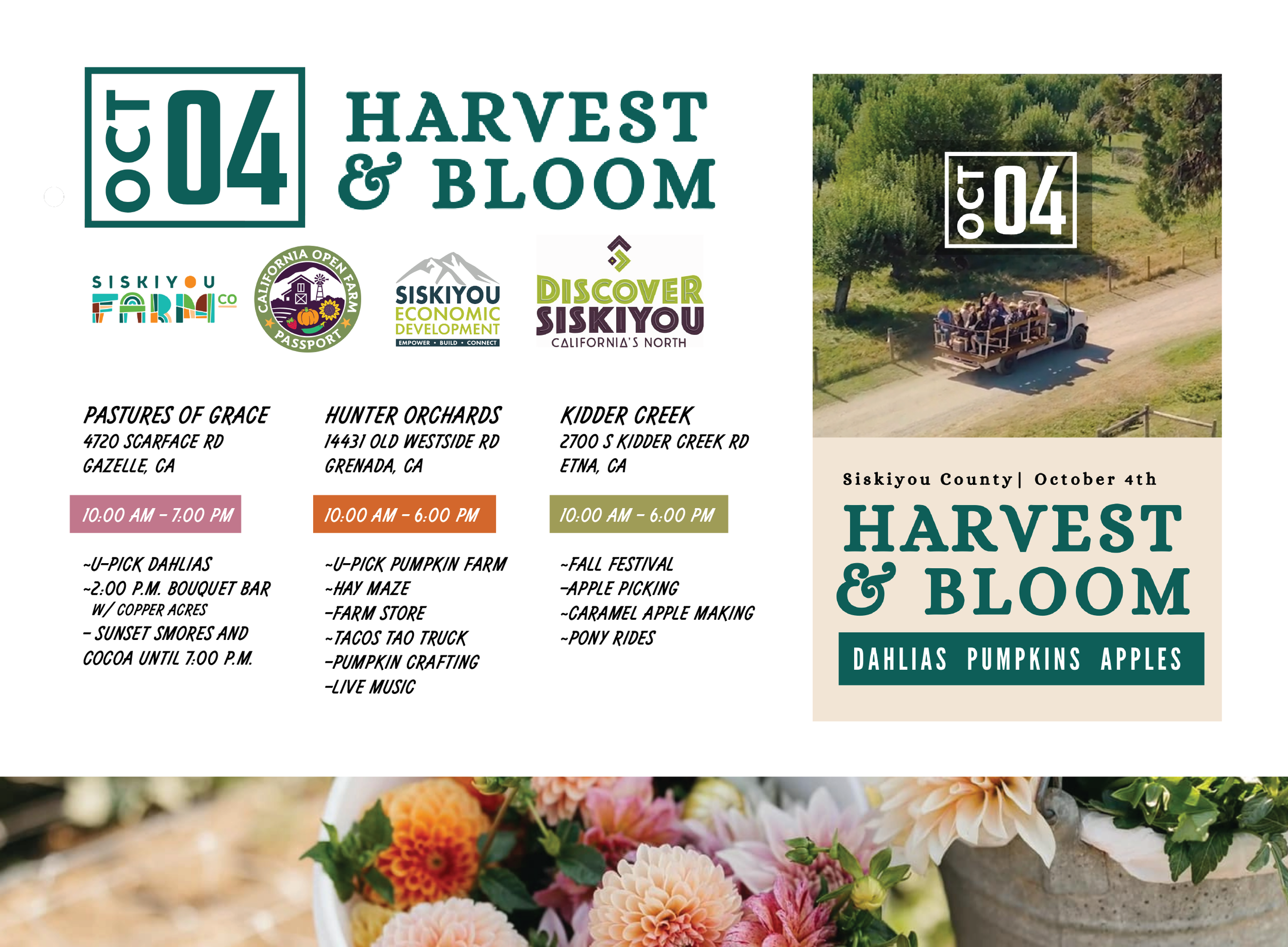 Tag us in posts: #HarvestAndBloom #DiscoverSiskiyou #SeeSiskiyou #CaliforniaFarms